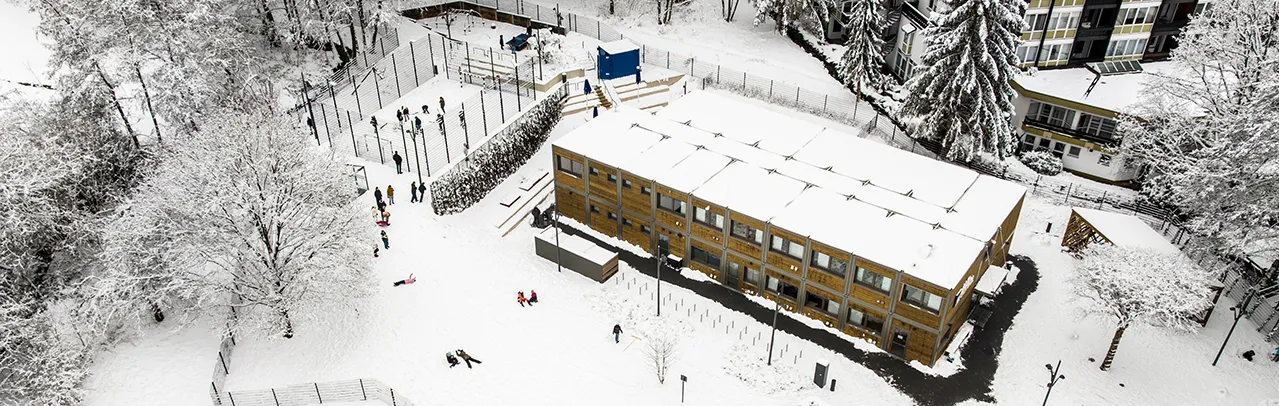 Die Wunder des Spessarts aus dem Klassenfenster erspähen, mitten im grünen Kurviertel lachen und lernen: Der Campus Lindenallee ist der ideale Ort für Entdeckergeist und Neugier. Zum Schuljahr 2025/2026 haben die beiden Gründungsjahrgänge den temporären Campus bezogen und füllen ihn mit Leben. Der Campus Lindenallee fügt sich in die zukunftsweisende ALEA-Architektur ein – Natur und Botanik spielen eine wichtige Rolle: Holzfassade, von Bäumen und Gräsern umgeben und viel Licht durch großzügig geplante Fenster.