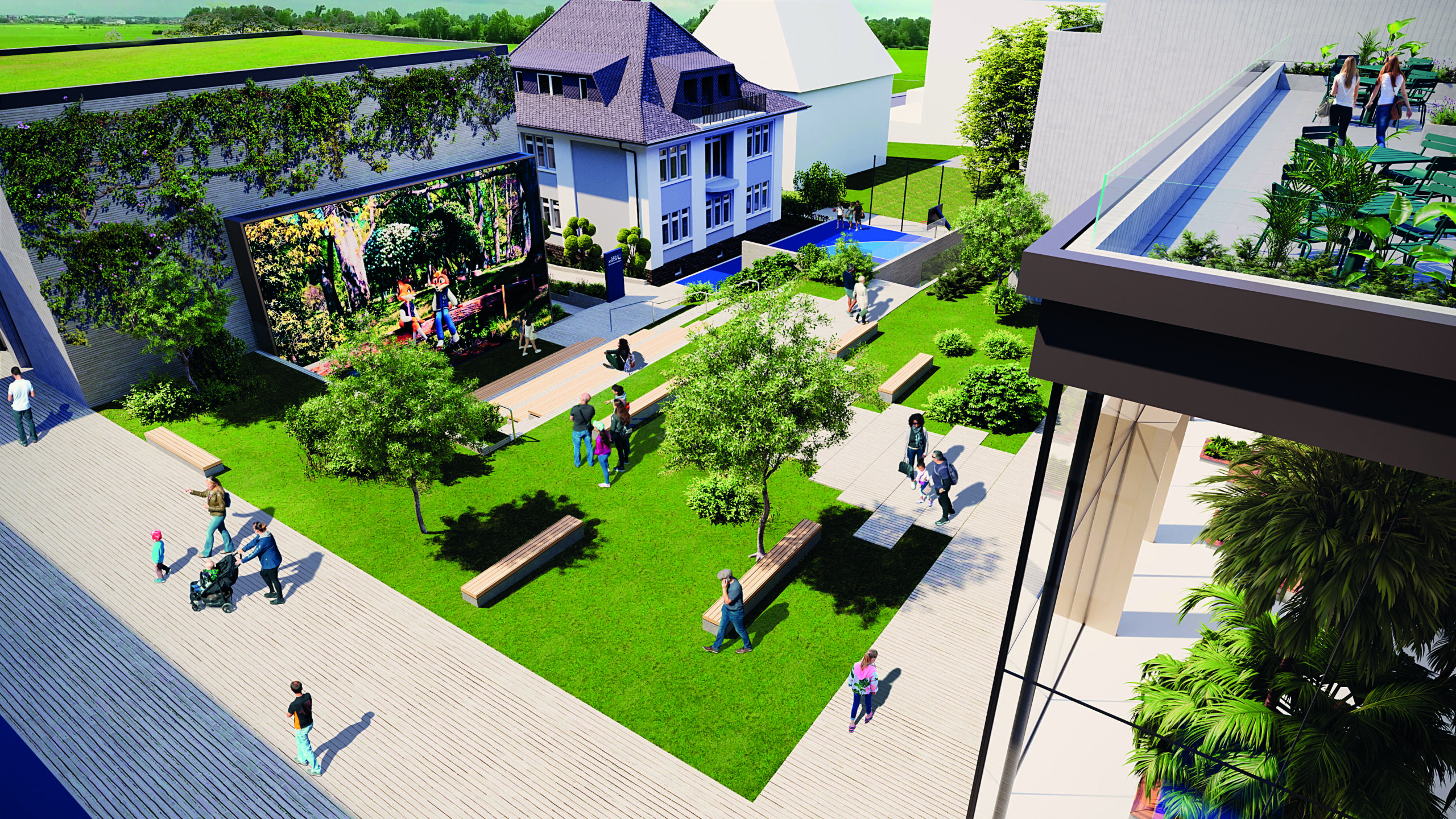 Outdoor stage, multi-sport court, spacious green areas, perfect park view: the inner courtyard of the campus ensemble is also the ALEA schoolyard – and an event space for career fairs and summer festivals.